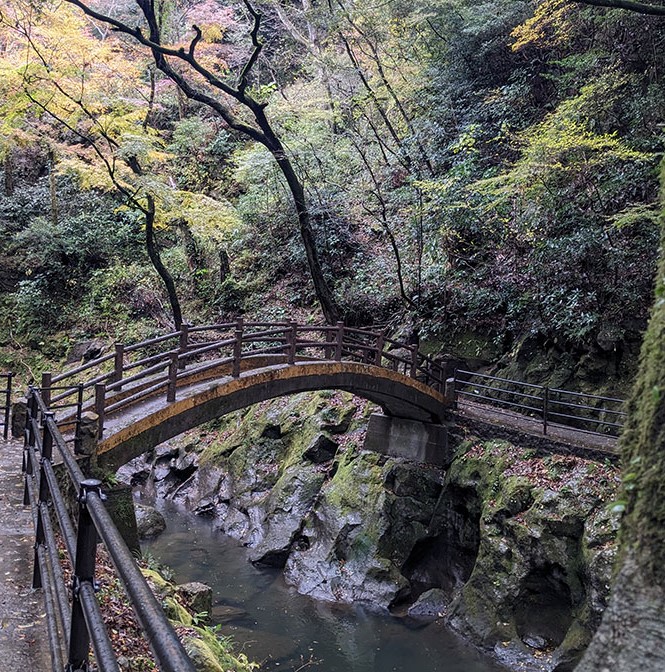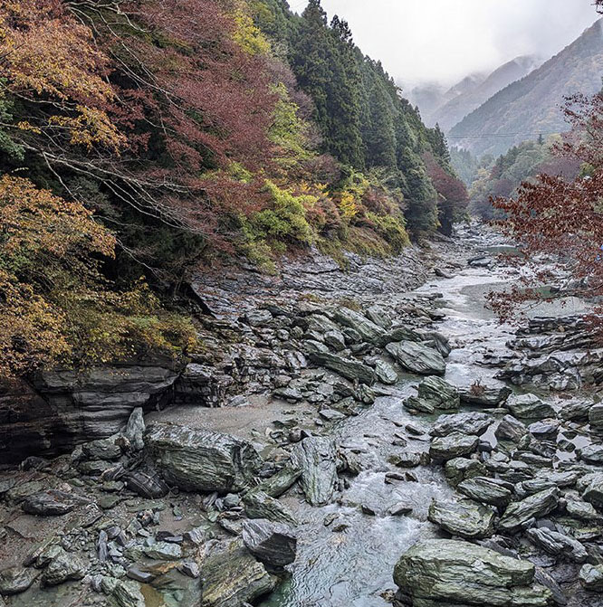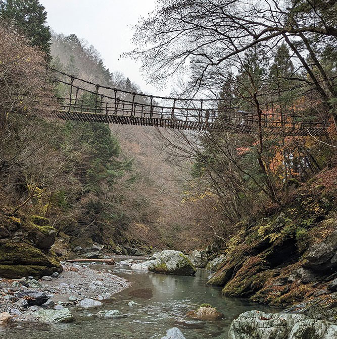 そしてこの祖谷かずら橋から30km離れたところに奥祖谷二重かずら橋があり、男橋は長さ42m水面上12m、女橋は長さ22m水面上4mで、どちらも祖谷かずら橋に比べて繊細というか歩きにくいというか、特に女橋は水面上4mでしたが、さな木とさな木の間隔かなり不揃いで歩行要注意の吊り橋でした。とはいえ不便なところにありますので観光客が少なく、男橋から女橋を通って遊歩道を一周し、川辺でせせらぎを聞きながら晩秋の渓谷の美しさと静けさを堪能できたのは幸いでした。(2024年1月)