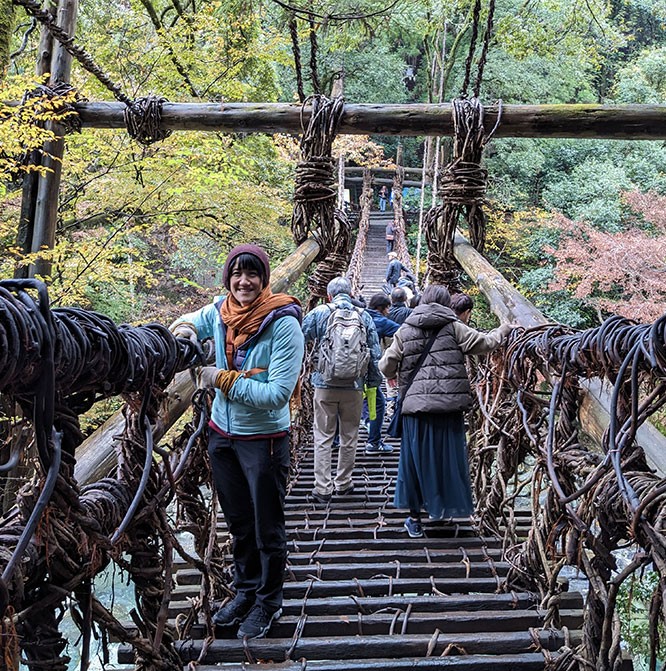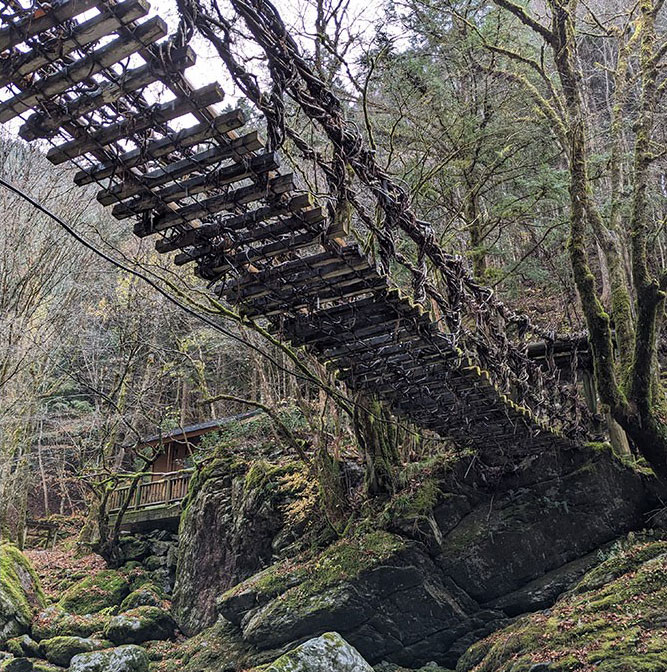 もうひとつは徳島県の祖谷峡です。1185年、壇ノ浦での源平最後の合戦で平氏は源氏に敗れて滅亡したのですが、平氏の落人が祖谷に逃れたという伝説が伝わっているというのです。勝者の源頼朝は厳しい残党狩りを行いましたので、落人は険しい山間部に潜伏し、かずら橋というシラクチカズラを網み連らねた橋をつくり、源氏の追ってから逃れるために切り落とせるようにしたという説があります。
