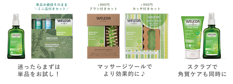![]() | ホワイトバーチ&ブラシセット 肌の引き締めやハリを保つために効果的なシラカバ葉エキスやナギイカダ根エキスをブレンドしたボディオイルと、オイルマッサージにおすすめの専用マッサージブラシのセット。 |