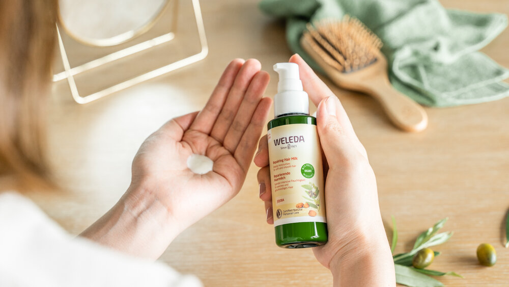 ヴェレダ ヘアミルクヒートプロテクト成分*配合で、 ドライヤーやアイロンなどの熱ダメージから髪を守る、洗い流さないトリートメント。