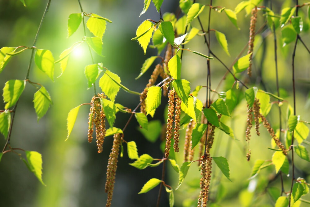 ホワイトバーチの花は尻尾のような形をしていて、4月~5月に雄花の花穂が垂れ下がり、上向きに雌花の花穂が付きます。花粉が風によって運ばれる「風媒(ふうばいか)」で、北海道の一部地域では花粉症の原因ともなっています。
