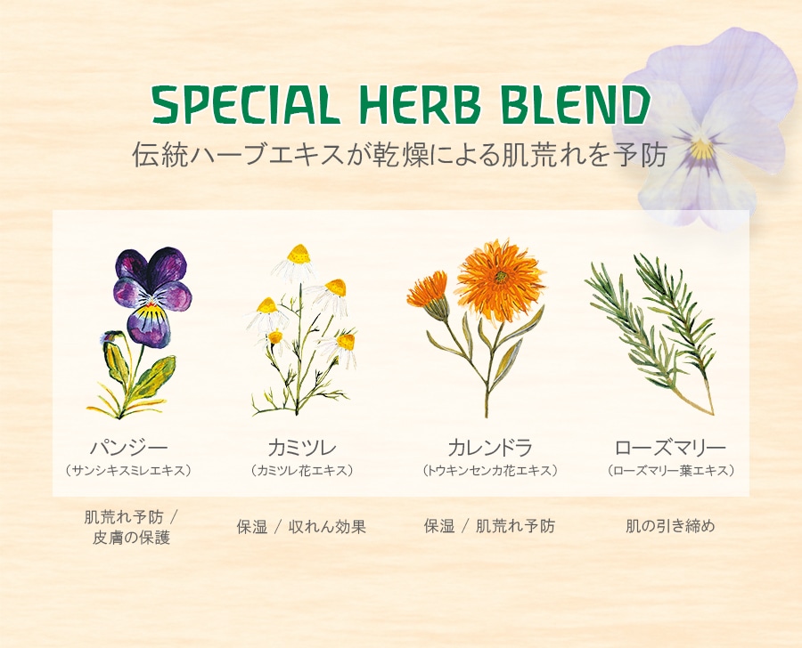 そんなスキンフードシリーズには、共通してパンジー・カミツレ・カレンドラ・ローズマリーの4つのハーブが配合されています。 これは、1926年の誕生当初から変わらない伝統レシピ。ハーブの保湿効果で肌のうるおいを保ち、乾燥による肌荒れを防ぎます。