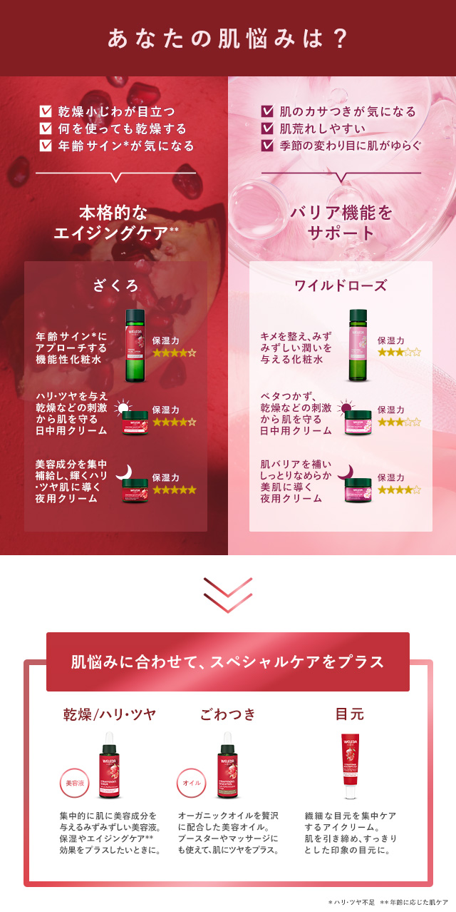 よりしっとり贅沢なうるおい感を与えるのが「ざくろ フェイスケアシリーズ」、必要なうるおいはきちんと与えながらも、みずみずしい軽やかな使用感なのが「ワイルドローズ フェイスケアシリーズ」です。