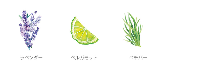 ラベンダー、ベルガモット、ベチバーの天然精油が生み出す、安らぎに満ちたハーブの芳香。