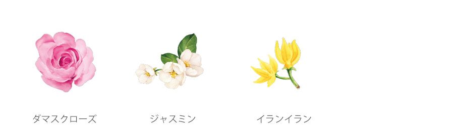 ダマスクローズ、ジャスミン、イランイランの天然精油が生み出す、愛に満ちた花々の芳香。