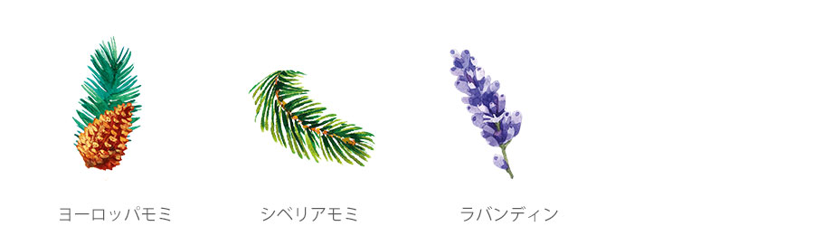 ヨーロッパモミ、シベリアモミ、ラバンディンの天然精油が生み出す、クリアで落ち着いた森の芳香。