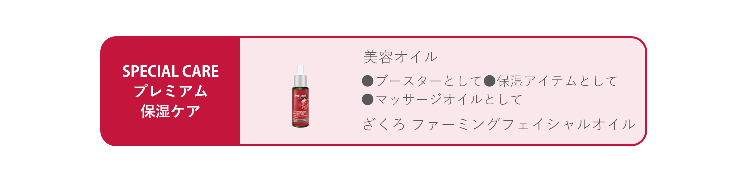 基本的な剤型の違いとして、【ざくろ ファーミングセラム】はオイルインタイブの美容液ですが、ほとんどが水分です。水溶性の美容成分を肌に与えて保湿しますので、ライトでみずみずしい感触がお好みの方におすすめです。
