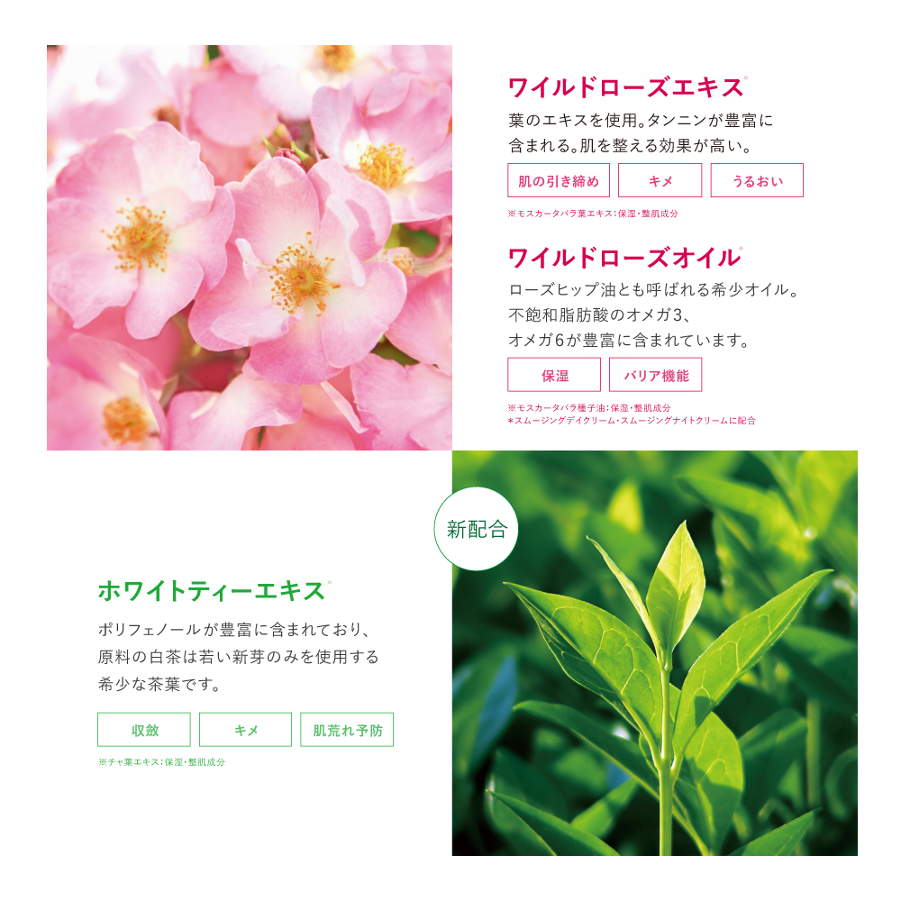 *1 化粧水:モスカータバラ葉エキス(保湿・整肌成分)/ ナイトクリーム:モスカータバラ種子油(保湿・整肌成分) *2 チャ葉エキス(保湿・整肌成分) *3 スフィンゴ脂質(保湿・肌荒れ防止)*4 保湿・整肌成分
