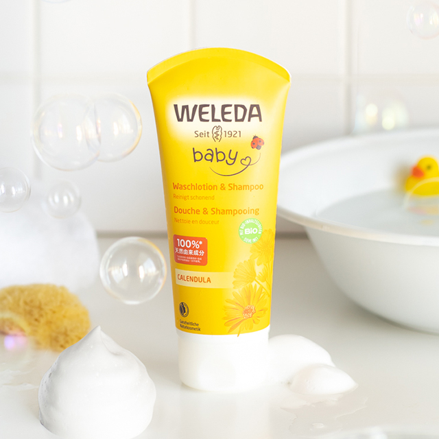 手のひら、またはタオルなどに適量をとって泡立て、お子様の髪・顔・身体をなでるように優しく洗い、その後流します。